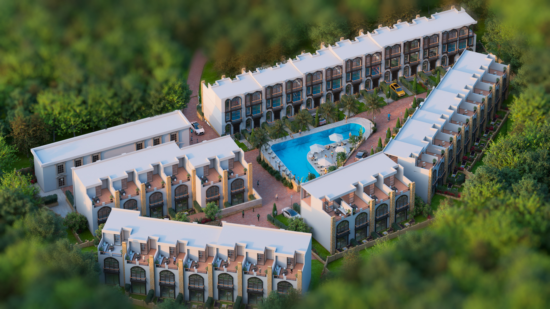 The project includes 40 premium townhouses, constructed with energy-efficient materials that provide excellent sound and heat insulation. The townhouses feature modern European architecture, full-height stained-glass windows, open terraces, and elegant exterior details such as pilasters and arched windows.