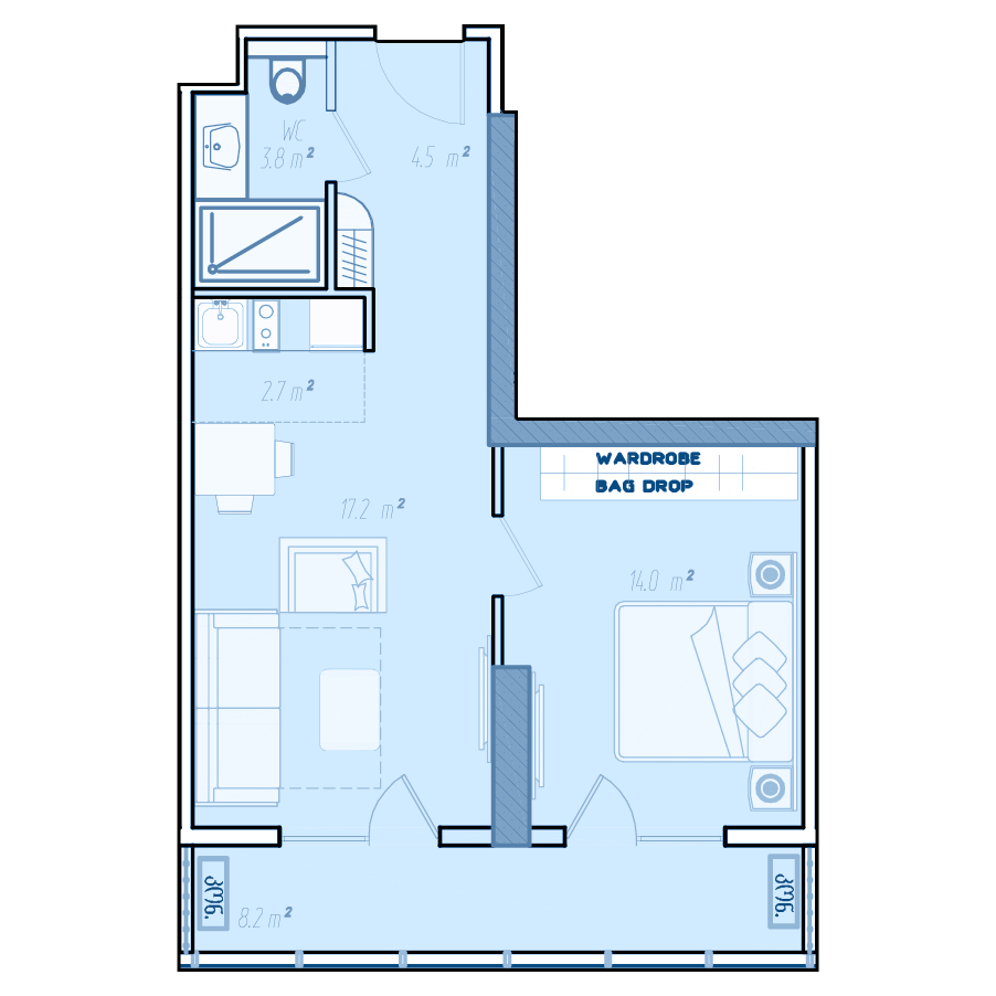 Если определиться с необходимым количеством комнат не удается, то стоит обратить внимание на площадь жилья. В комплексе BlueSky Tower можно купить квартиру площадью от 35 м² до 170 м².
