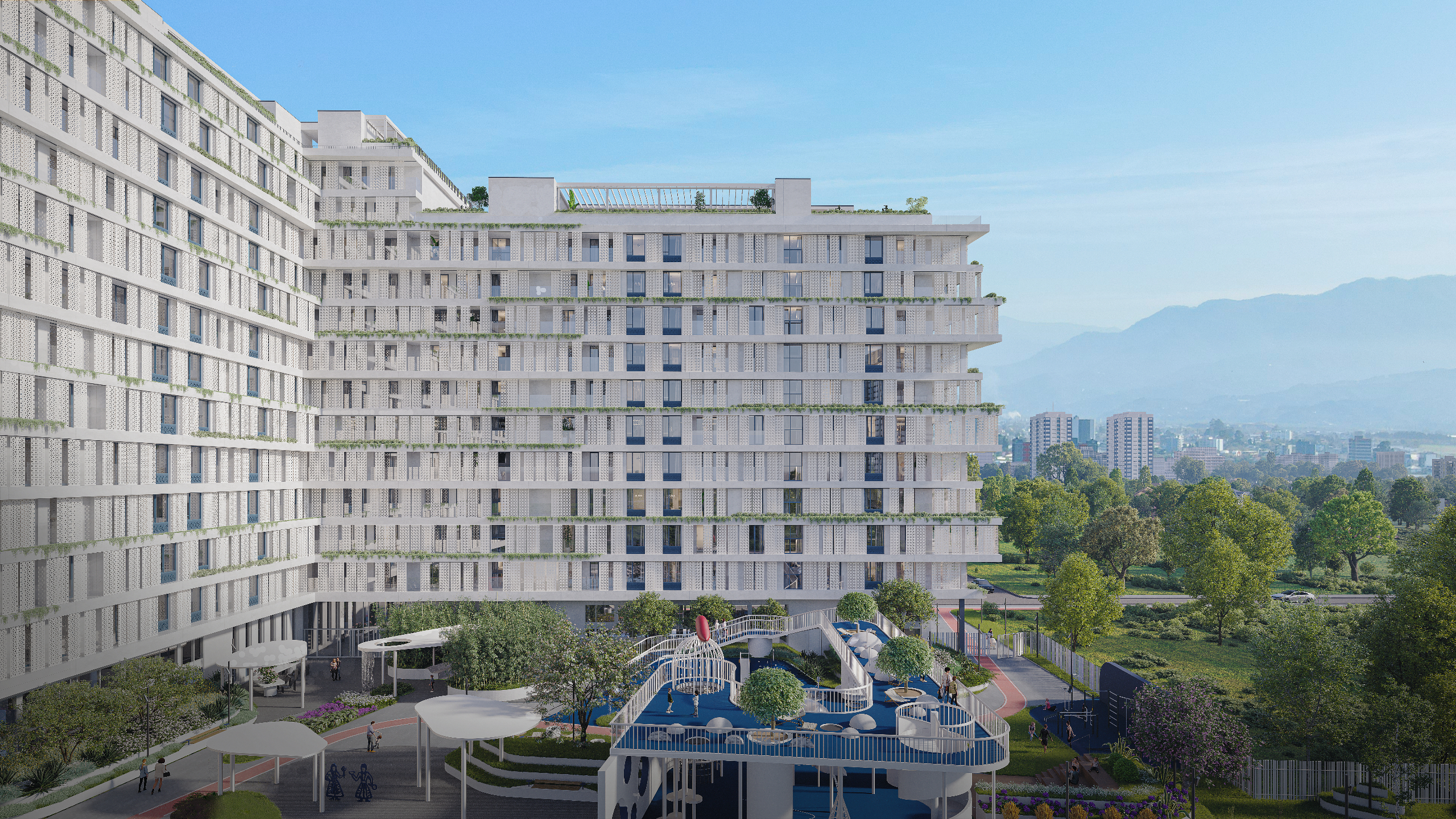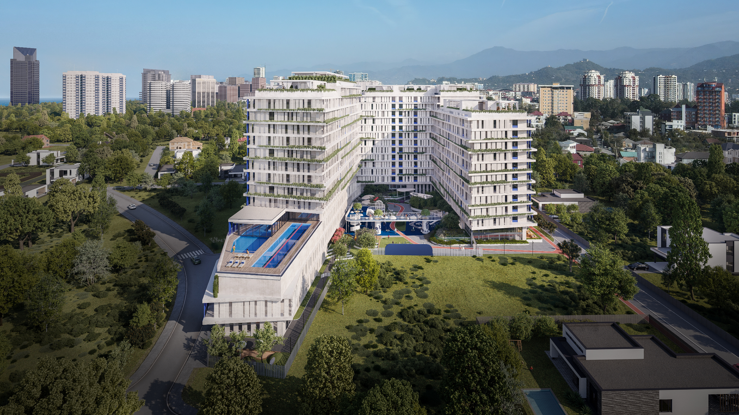 SUMMER 365 — это выдающийся жилой проект в Батуми, предлагающий современный и комфортный образ жизни. Расположенный по адресу улица Коте Абхазии 43, комплекс находится всего в 600 метрах от моря, обеспечивая легкий доступ к пляжу. Проект выполнен с уникальной архитектурной концепцией, напоминающей стопку книг, что подчеркивает интеллектуальный и продуманный дизайн. Внешний вид включает зеленые фасады и динамичную игру света и тени, что делает здание визуально привлекательным в различных погодных условиях.